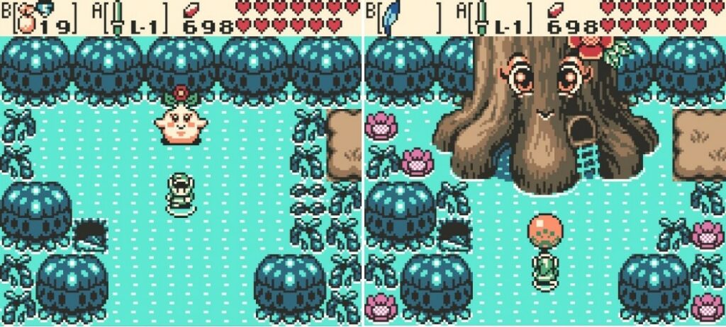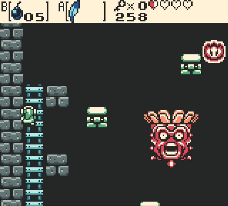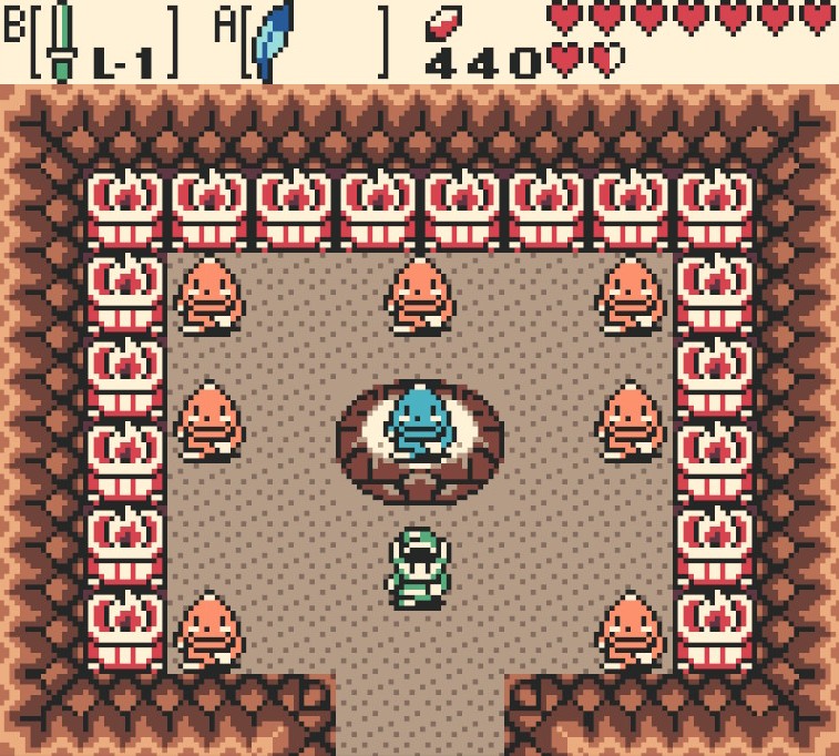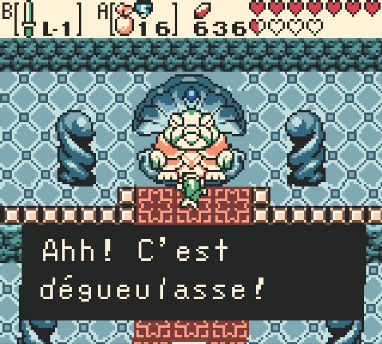 Tout ce blabla pour te dire que le monde de Labrynna était un véritable plaisir à parcourir en 2001 et l’est toujours aujourd’hui. La Game Boy crache des environnements colorés et diversifiés à la façon d’un branleur en survêt qui crache dans la rue. Petit bémol sur le bestiaire qui reste très classique, respectant le dogme religieux du culte de la princesse blonde à la lettre (a noté que c’est un Zelda sans Zelda). Côté quêtes annexes c’est un peu chiche aussi. Mais là franchement je suis un peu (beaucoup) un gros con malhonnête parce que le contenu global est vachement généreux pour une vieille cartouche de quelques mégas octets. D’ailleurs ce sont surtout les donjons (au nombre de huit) qui forment le plat principal de Oracle of Ages.